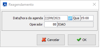 O sistema vai exibir uma tela de reagendamento onde será possível informar a data da nova agenda e o operador que irá fazer o contato.