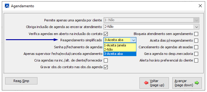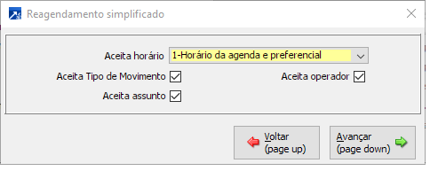 Já no modelo simplificado o sistema dará algumas opções "pré prontas" de horários e vai criar automaticamente o reagendamento sem que seja necessário o operador inserir muitos dados.