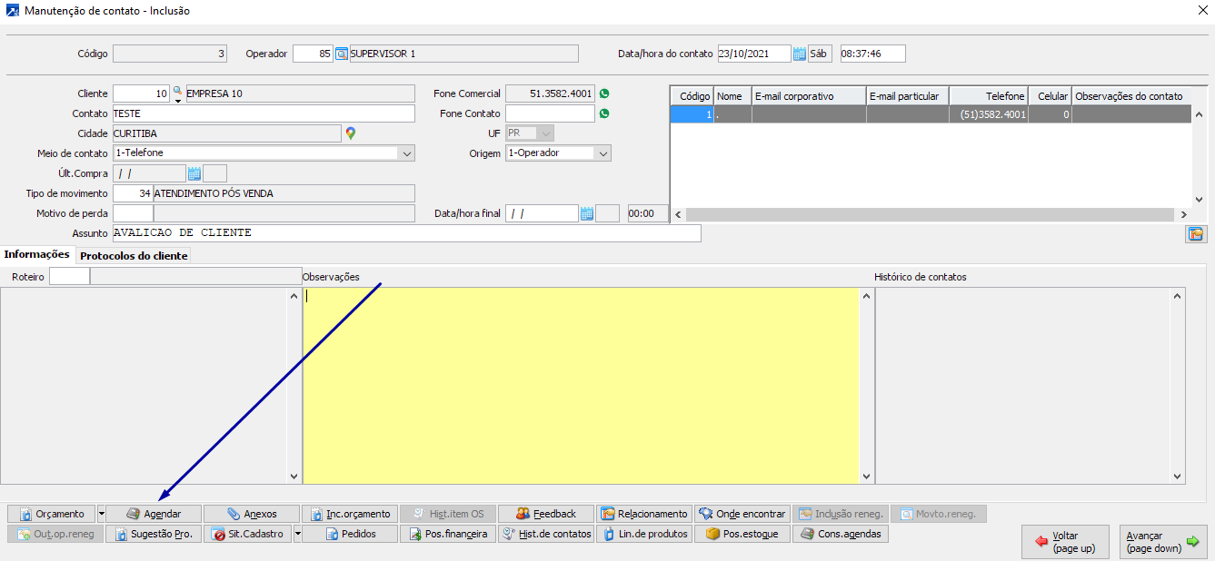 Então por dentro do registro do contato onde o operador está efetuando o cadastro da "ligação atual" ele já irá criar a nova agenda para posterior retorno conforme combinado com o cliente.