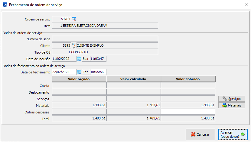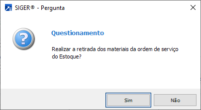 Ao avançar na janela de fechamento (abaixo), será exibida mensagem solicitando confirmação da retirada dos materiais do estoque.