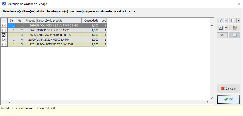 SE o "Tipo de integração com estoque" = 2-Seleciona saída interna no fechamento, será exibida janela/grid abaixo para que o usuário possa selecionar os materiais que deseja fazer movimento de saída interna para os materiais do Item da OS.