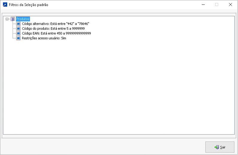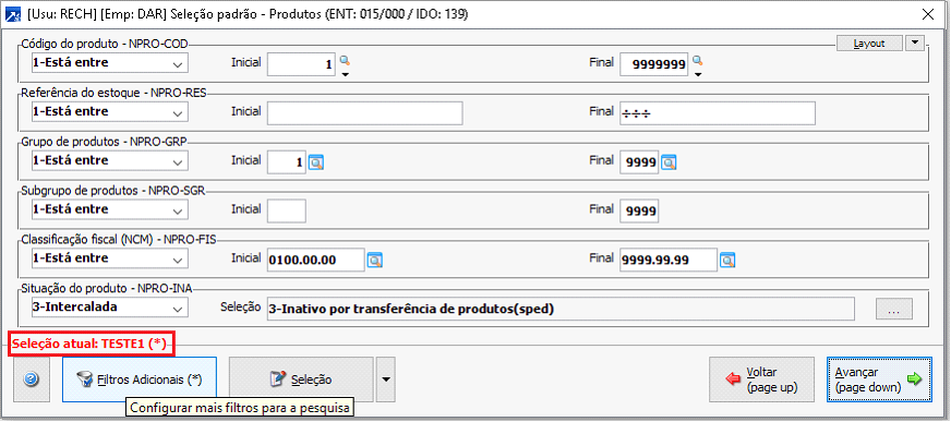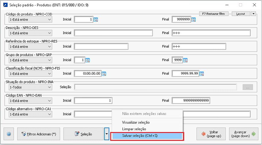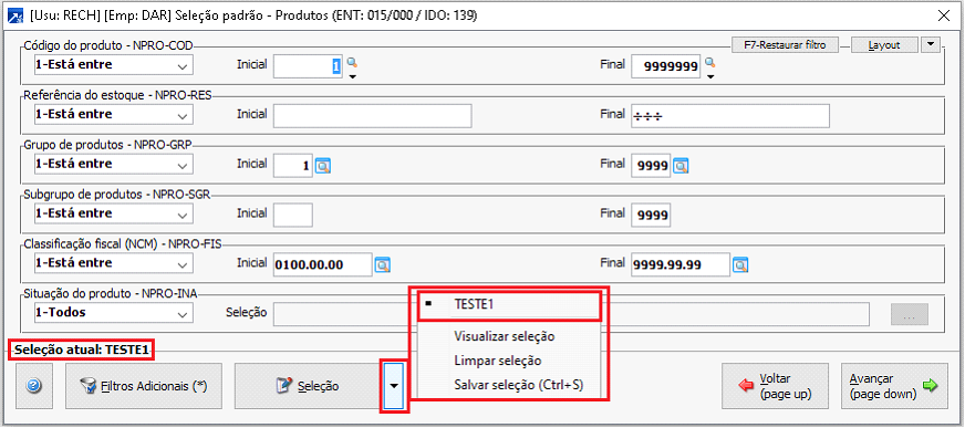 Em um mesmo relatório podemos ter n seleções gravadas. Ao lado do botão ‘Seleção’ há um extensor que permite a definição da seleção.