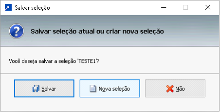 Nas situações onde as alterações foram feitas baseadas em uma seleção já criada, é exibido uma mensagem questionando se será criada uma nova, ou se é apenas a alteração da que já existe.
