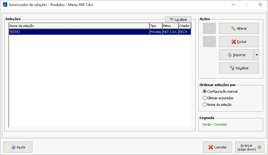 Clicando na Seleção exibida pelo grid, e posteriormente em <Alterar>, é exibida a tela das configurações, porém ela tem um campo especifico diferente comparado à tela da inclusão.