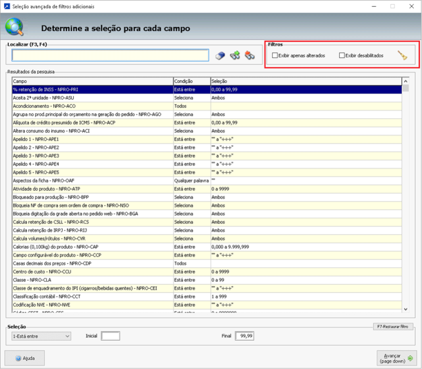 - Exibir apenas alterados: Irá mostrar apenas aqueles que têm alguma seleção.