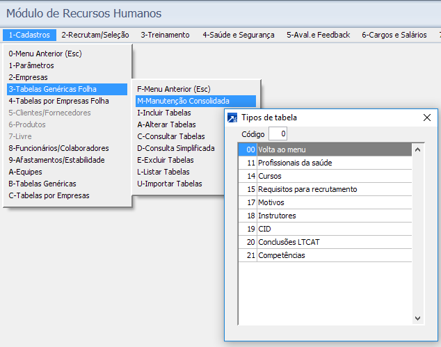 As tabelas genéricas são cadastradas no menu 1.3-M as mesmas servem para todas as siglas/ empresas que estão na mesma base no SIGER do Cliente.