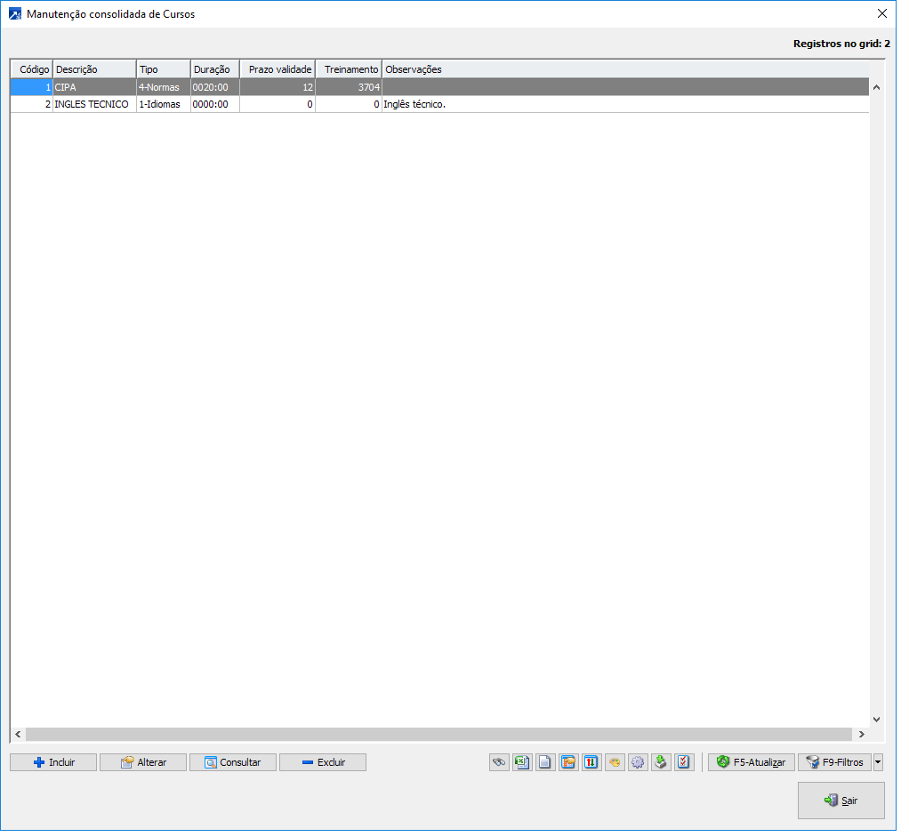 Ao clicar encima de cada tabela acima, vai abrir uma nova tela que permite incluir, alterar, consultar ou excluir dados, ou seja, possui todas as opções possíveis em única tela. Mas se optares fazer as mesmas funcionalidades em telas separadas, basta navegar nas outras opções do menu 1.3-I, A,C,D,E,L e U.