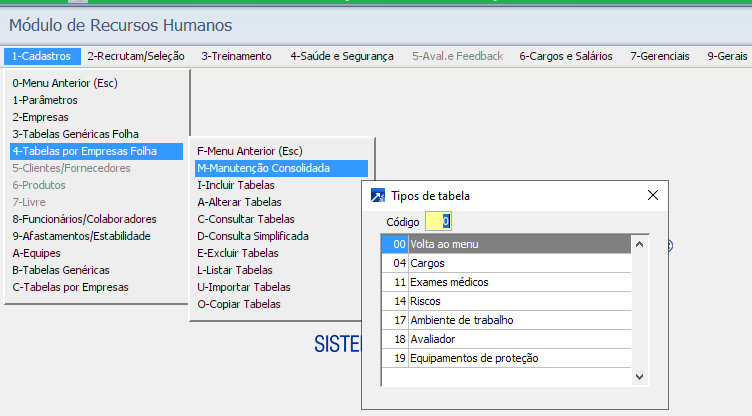 No menu 1.4-M e 1.4-I são cadastradas as tabelas por Empresas, as mesmas servem somente para a sigla/Empresa especifica selecionada, ou seja, não valem para as demais siglas/Empresas da mesma base do SIGER®. Abaixo temos a lista das tabelas por sigla/empresas utilizadas no módulo de RHU.