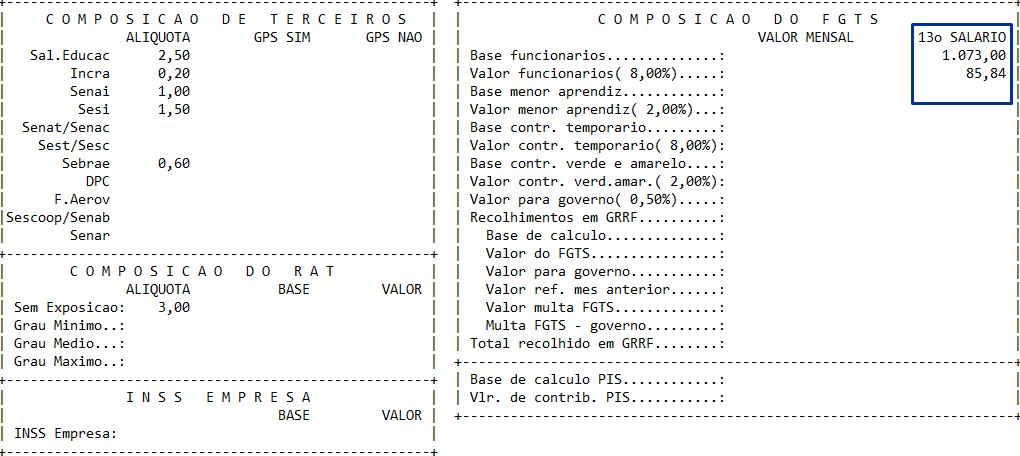 Obs.: sobre o adiantamento do 13º salário, é necessário recolher o FGTS e será recolhido junto com a folha mensal. No total sintético da folha mensal, menu FPA4.1-T, SIGER® demonstra no quadro composição do FGTS, o valor do FGTS mensal e do adiantamento do 13º salário.