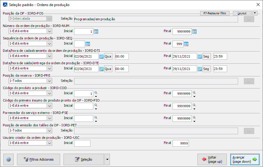 Ao avançar a primeira seleção teremos outras duas seleções padrões, sendo a primeira de "Ordens de produção" que possibilita filtros relacionados às OPs.