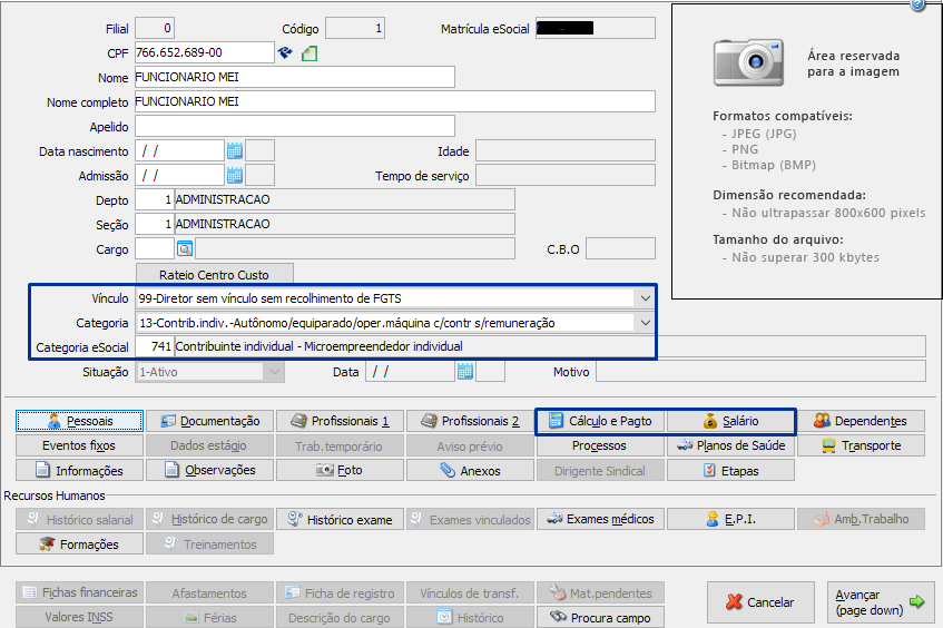 O cadastro do funcionário MEI é obrigatório quando a empresa precisa fazer o recolhimento do INSS PATRONAL sobre o serviço prestado. Desta forma, o cadastro do funcionário MEI (Microempreedor Individual) é no menu FPA 1.8-I, e tem a particularidade do vinculo 99, categoria 13, categoria eSocial 741, no botão <Cálculo e Pagto>, desmarcar a check box RECOLHE INSS e no boão <Salário> informar o valor 0,01.