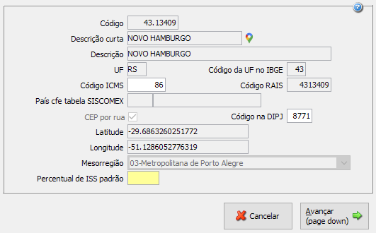 Informar o percentual do IMPOSTO de ISSQN no menu 1.B-A, tabela 58, no campo "Código" utilize a tecla F8 para selecionar a cidade que a empresa esta localizada e informe o percentual do imposto ISSQN no campo "Percentual de ISS padrão".