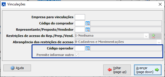 Vinculação com operador, no botão <Vinculações>