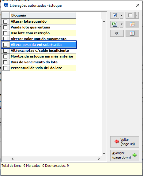 Liberação para alteração de peso, no botão <Liberações autorizadas>, botão <Controle de Estoques>, campo "Altera peso de entrada/saída"