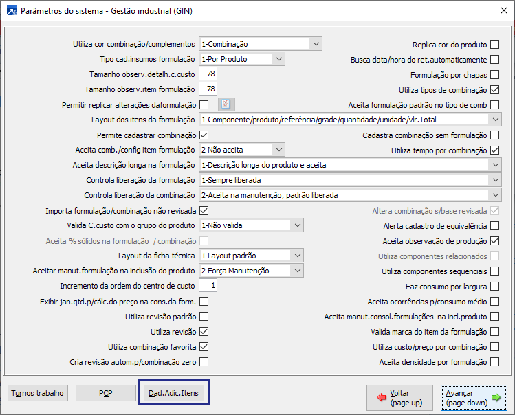 Inicialmente no caso de uma implantação, será necessário uma fase de cadastramentos, para tal, precisa configurar no GIN 1.1-P, botão <Gestão Industrial>, botão <Dad.Adic.Itens>:
