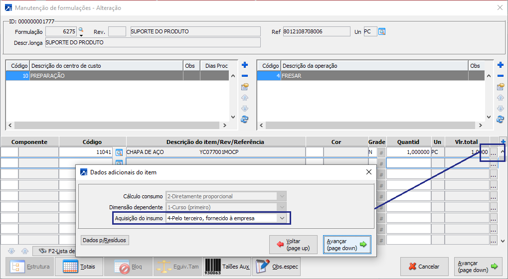 No menu 1.7-A - Alteração de Formulações/Estruturas, nos itens, botão <Dados adicionais do item>:
