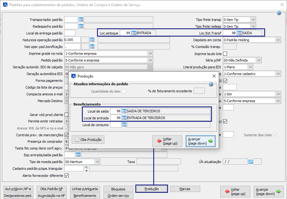 Também é possível definir os campos "Loc.estoque= Local de entrada do cliente" para entrada das notas fiscais do cliente, e campo: "Loc.Est.Transf.=Local de saída do cliente" para utilizar no faturamento na emissão das notas fiscais de retorno de beneficimento.