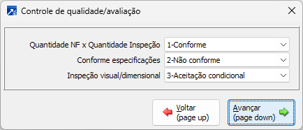 Obs: O acesso a essa janela só é disponibilizado se marcado o campo “Informa controles de qualidade” nos parâmetros gerais (menu 1.1-P, botão [Compras], botão [Entrada nota O.C.]).