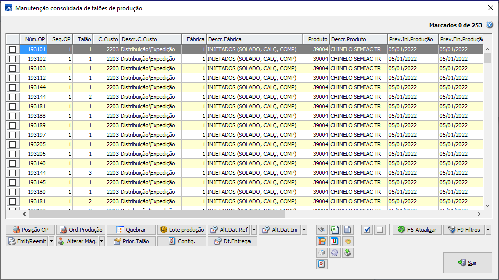 Abaixo é exibida a Janela de Manutenção Consolidada de talões filtrando uma ordem de produção programada para 20/03/2020, exibindo os talões juntamente com os centros de custo, os dias de processo, e as datas de referência definidas automaticamente na emissão dos talões: