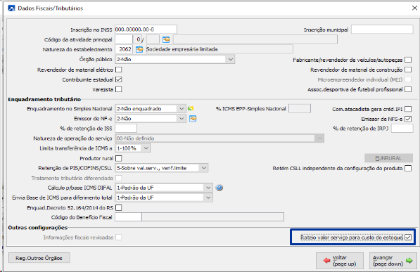 Depois que for confirmada essa configuração, ao acessar os cadastros de fornecedor, no botão <Fiscais>, vai estar habilitada a configuração "Rateio valor serviço para custo do estoque", que deve ser marcada em todos os fornecedores de serviço cujas notas devem agregar custo aos itens de importação.