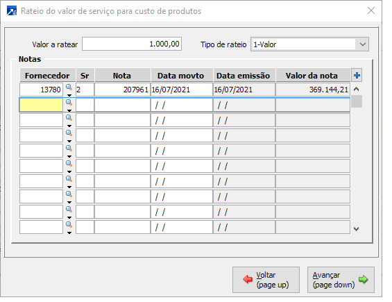 No menu 2.7-I dos Livros Fiscais, ao concluir o lançamento de nota de serviço de fornecedor que esteja configurado para Ratear o valor do custo no estoque, irá abrir uma janela para referenciar em que nota(s) quer ratear esse custo e em seguida, em quais itens.