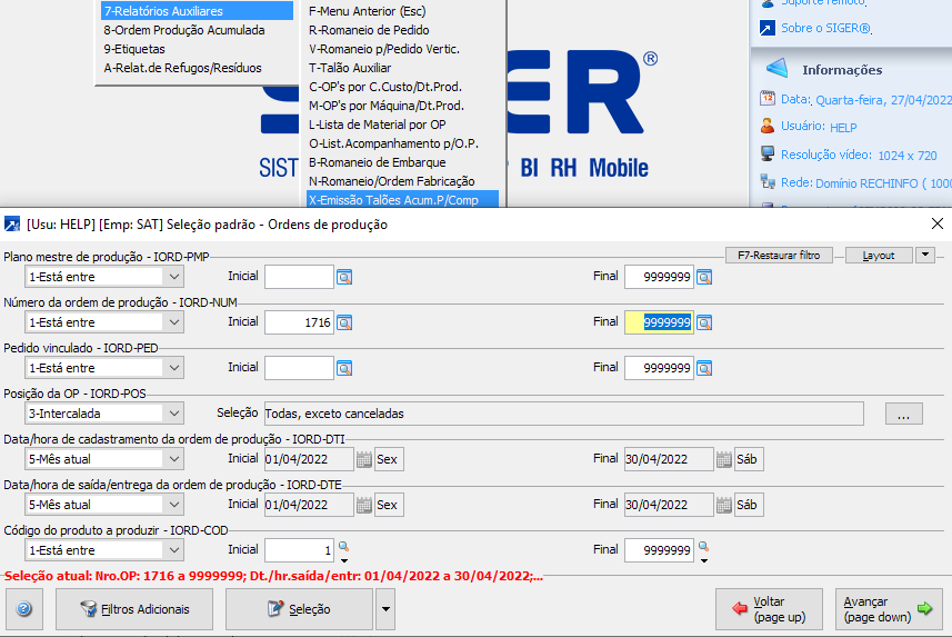Neste programa abre a seleção padrão de ordens de produção para emissão, listará conforme formulário RFP configurado na empresa do GIN.