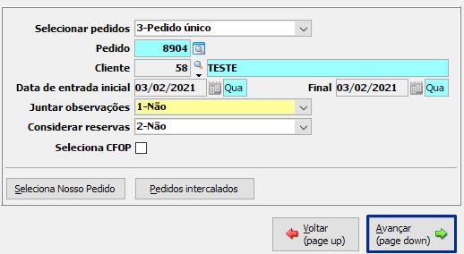 Ao escolher a opção "2-Não seleciona" no campo "Selecionar pedido", o sistema obrigará o usuário a informar um cadastro no campo "Cliente" e em seguida, no campo "Data de entrada inicial / final", o usuário poderá informar uma faixa de datas para processamento dos pedidos.