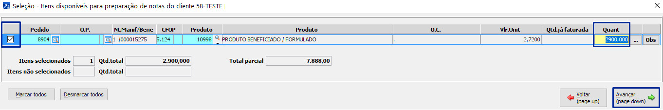 Lembrando que nesta tela serão exibidos somente itens com a CFOP 5/6.124, uma vez que os itens de CFOP 5/6.902 serão relacionados através da formulação no momento da emissão da NF-e.