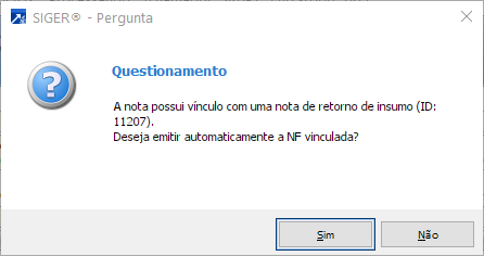 Durante o processo de emissão, o sistema irá verificar que juntamente com a nota de cobrança do serviço de beneficiamento existe uma segunda nota vinculada (materiais), e então irá questionar se deseja emitir esta outra nota.