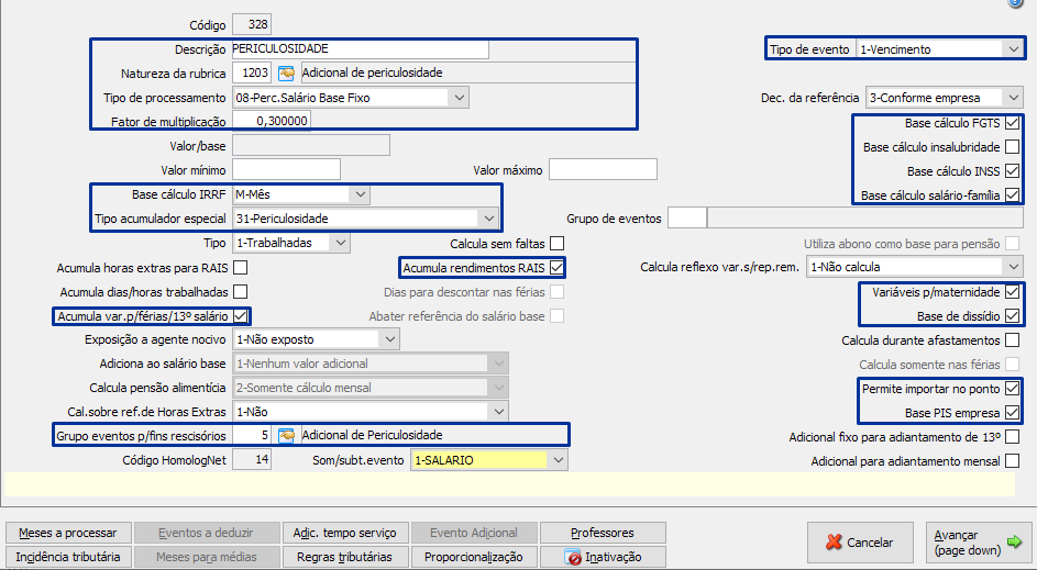 Menu FPA1.7-I, utilizado para cadastrar novo evento no campo código pressionar as teclas F4 + Enter para buscar o primeiro código disponível. Neste exemplo, vamos configurar o evento de Periculosidade para calcular 30% sobre o salário base fixo do funcionário.