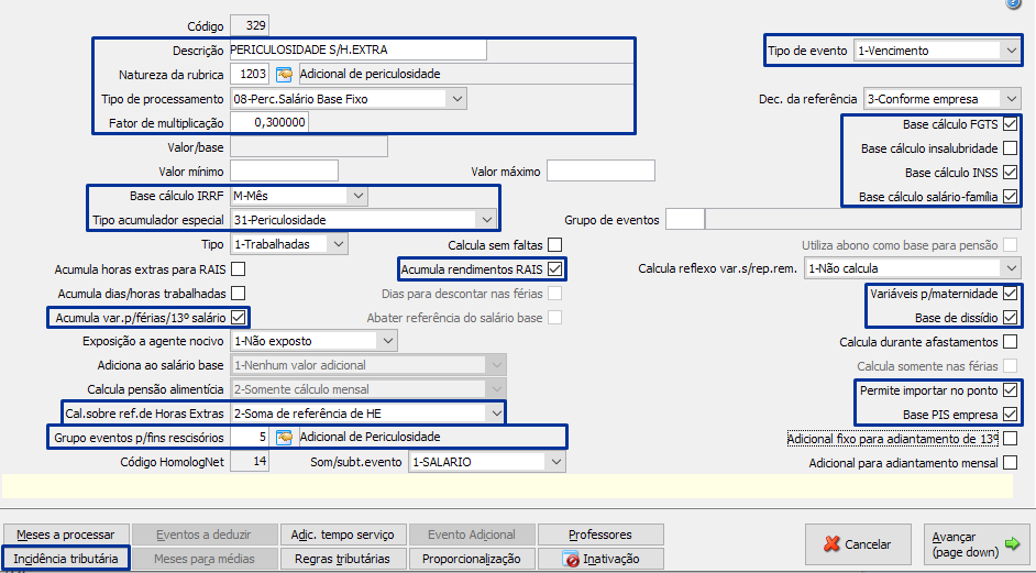 O adicional de Periculosidade deverá ser calculado sobre as horas extras, e no SIGER® poderá configurar a hora extra para calcular sobre a Periculosidade ou cadastrar novo evento de Periculosidade para calcular somente sobre as horas extras.