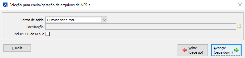 Quando seleciona a opção "1-Enviar por e-mail" será obrigatório informar o e-mail no botão <E-mails>, para salvar em disco será obrigatório informar a localização ou caminho para geração do arquivo, no campo "Localização".