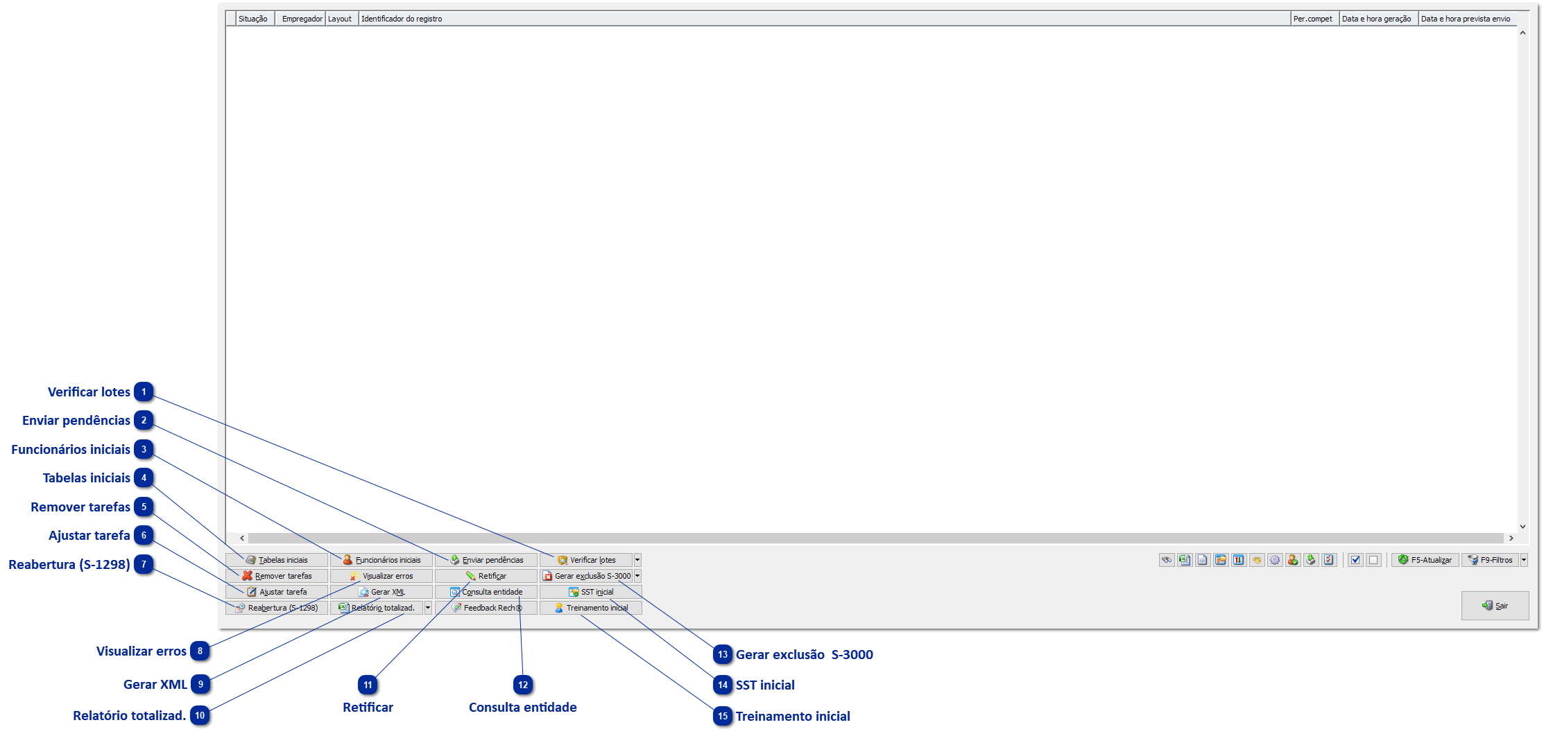 - Conheça a janela do gerenciador de envio para eSocial, menu FPA 7.8-V e seus principais botões e funções.