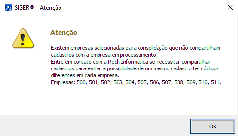 A análise ABC possibilita a consolidação de empresas, desde que as mesmas compartilhem os mesmos cadastros de clientes e fornecedores. Caso as siglas de empresas selecionadas não compartilhem os cadastros, será exibida mensagem de atenção, conforme exemplo a seguir.