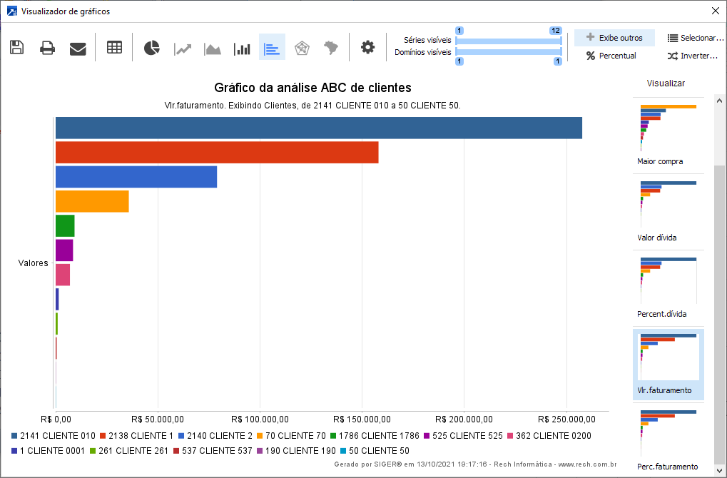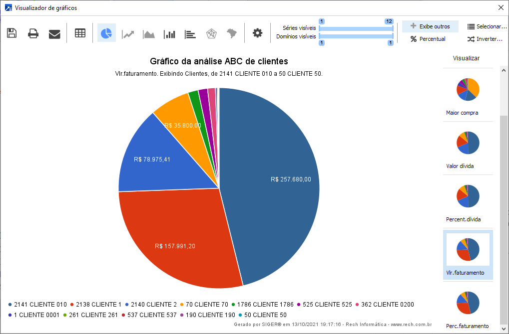 Observação: Na lateral direita do gráfico estão as opções de gráficos para visualização, podendo selecionar o valor da última compra, a maior compra, valor da dívida, percentual da dívida, valor do faturamento ou percentual de faturamento.