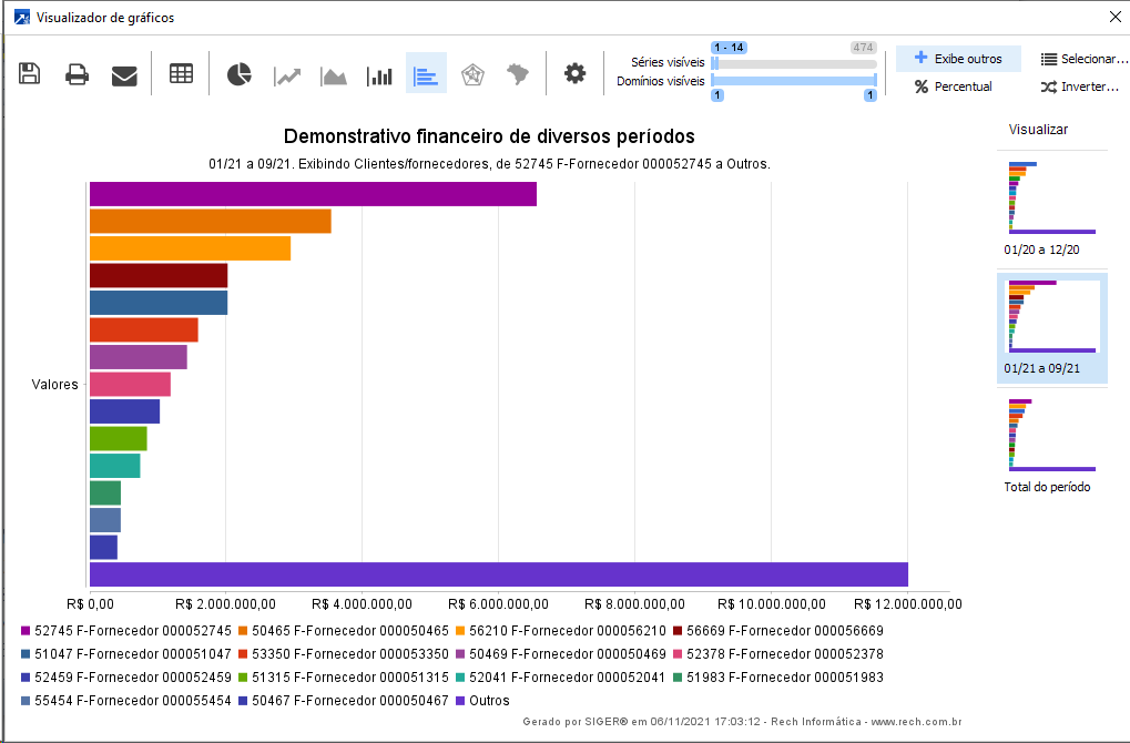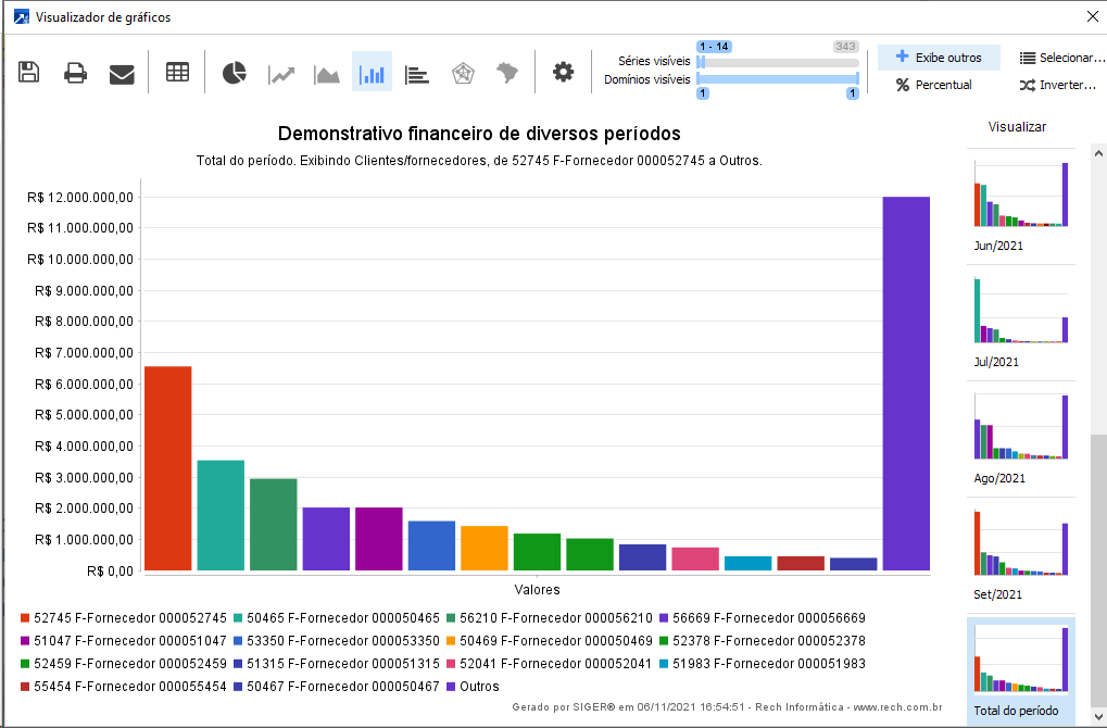 O gráfico do demonstrativo financeiro diversos períodos totaliza os valores realizados de clientes e fornecedores, conforme os períodos selecionados, acumulando por mês, bimestre, trimestre, quadrimestre, semestral e anual.