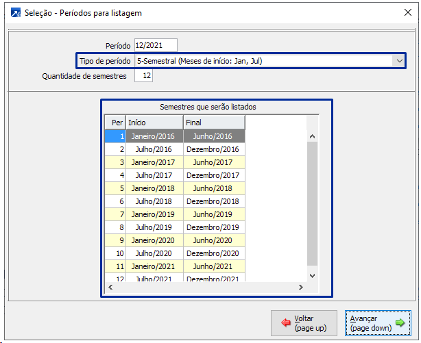 Semestres que serão listados: Tipo de período semestral