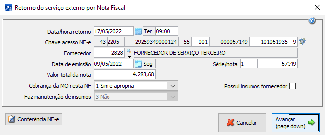 No retorno do serviço externo são utilizados apenas alguns campos da NF-e para carregar, a partir deles, informações como os talões a serem retornados e as notas de remessa dos insumos.
