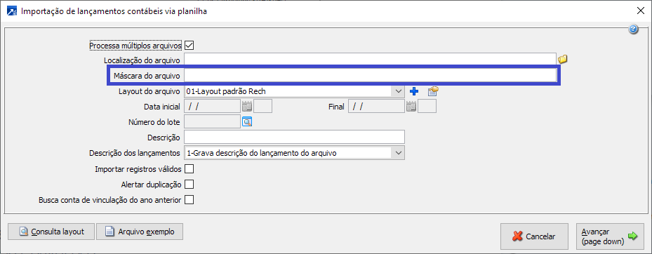 2) Quando marcado, deve fazer o uso de uma máscara de arquivo e não o nome de arquivo diretamente: