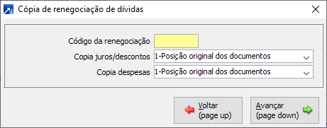 Neste campo está disponível a Função F3-Copiar dados, essa Função possibilita selecionar outra Renegociação para copiar os Documentos. Somente é permitido copiar Renegociações das seguintes situações, 06-Encerrado com acordo não aceito pelo cliente/fornecedor; 07-Encerrado com acordo não aceito pela empresa e 99-Renegociação cancelada/revertida.