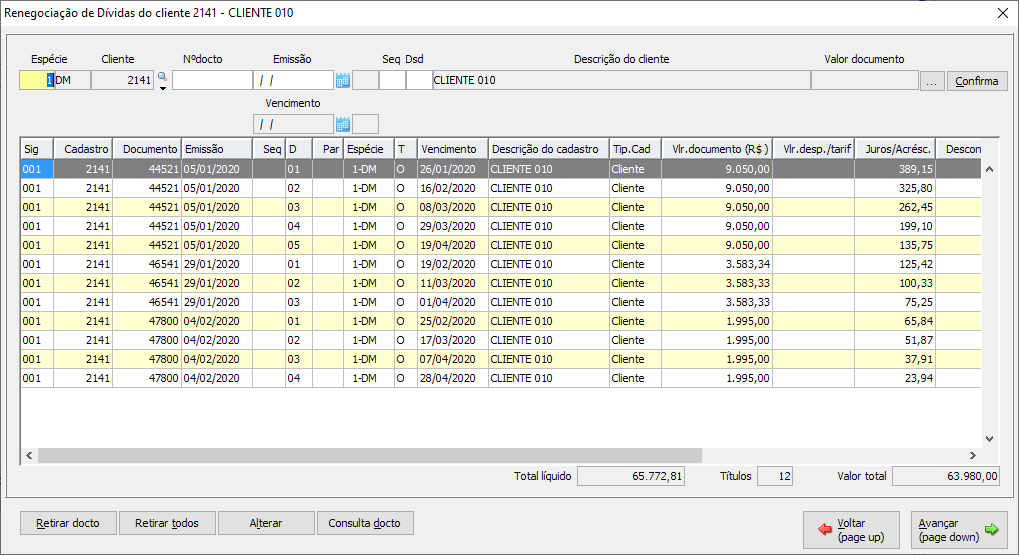 Na sequência será exibida a janela Renegociação de Dívidas com o código do cadastro, nessa janela é possível incluir outros Documentos, pois a carga inicial dos Documentos são os vencidos, caso o usuário queira incluir os Documentos em aberto na Renegociação. Para isso estão disponíveis as Funções F3-Doctos agrupados, F4-Sel.doctos, F7-Outros acessos, F9-Doctos geral e F10-Sel.doctos p/planejamento na Linha Amarela.