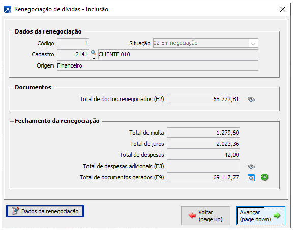Não realiza o calculo a partir dos dados informados na janela "Dados da renegociação";