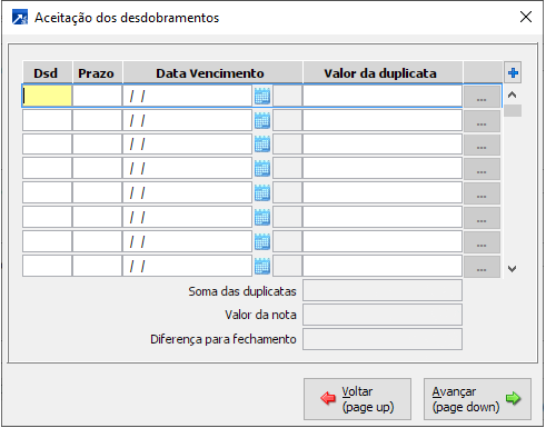 Data vencimento: Dia para o vencimento do desdobramento, quando informada calcula o numero de dias do prazo.