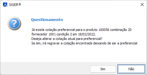 Ao selecionar uma cotação como preferencial, se já houver outra cotação para o produto/combinação marcada como preferencial o usuário será avisado e caso confirme a cotação será regravada, deixando apenas a nova como preferencial.