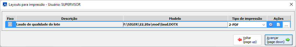Imprime laudo selecionado, utilizando formulário configurado na empresa do estoque, botão [Rastreabilidade], botão [Laudo], campo "Modelo laudo lote".