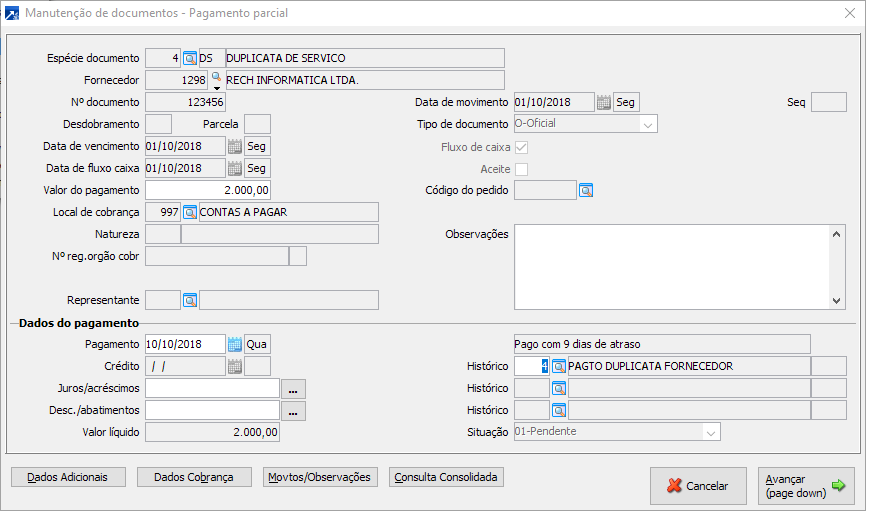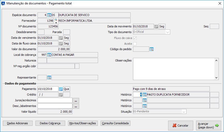 O pagamento documento é a fase final de sua manutenção. Ele pode ser feito de forma Parcial, ou Total.
