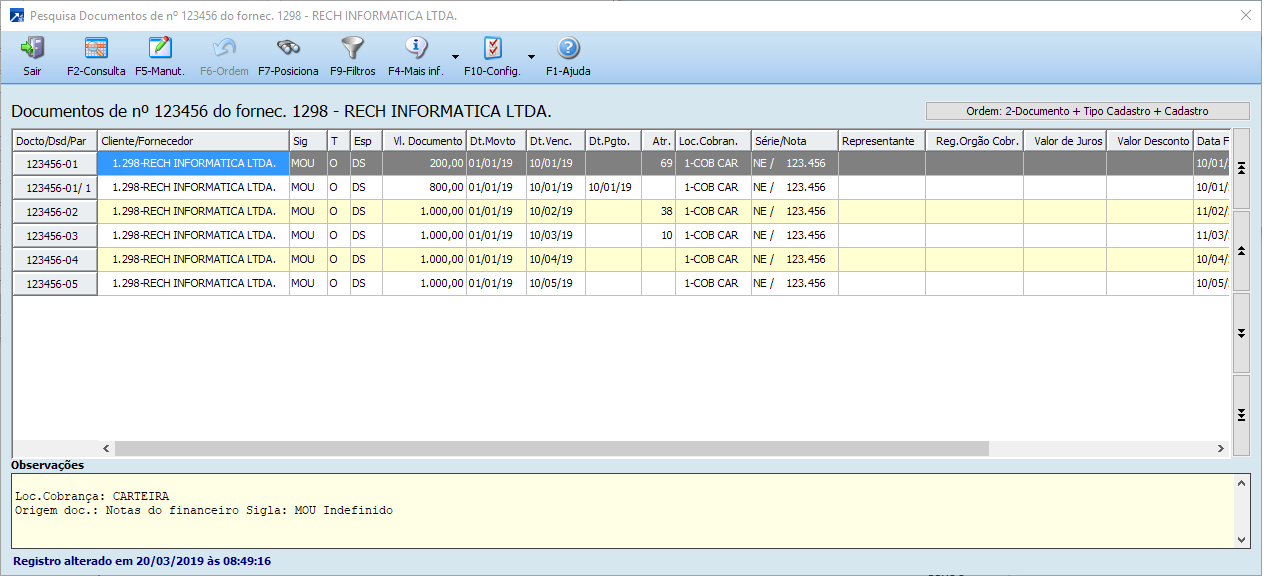 Ao avançar, veremos uma parcela do valor pago, e o restante em aberto. Caso o documento tenha mais um pagamento parcial, haverá mais de uma parcela: