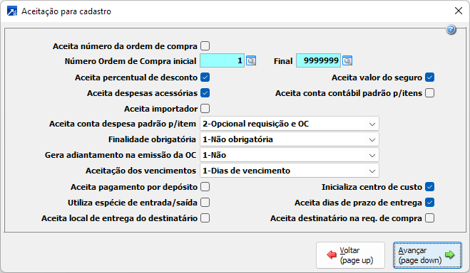 Parâmetros referente as aceitações para cadastro da Ordem de Compra.