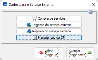 Configurações de compra de serviços, menu COM 1.2-A ou GIN 1.2-A, botão [Serviço Externo], botão [Manutenção da OP].