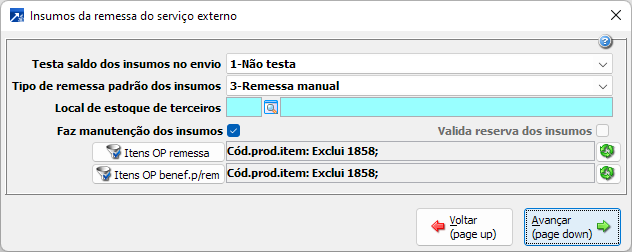 1-Definido na OP: Indica que sugere na remessa do serviço externo o fornecedor definido na inclusão ou programação da ordem de produção.